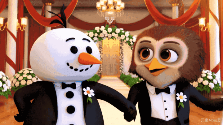 但这个雪王和多儿,有点难绷,虽然能认出来是猫头鹰,但……这有可能是「为了规避版权风险的一种方式」。还有,倒着走进婚姻殿堂真的很好笑。