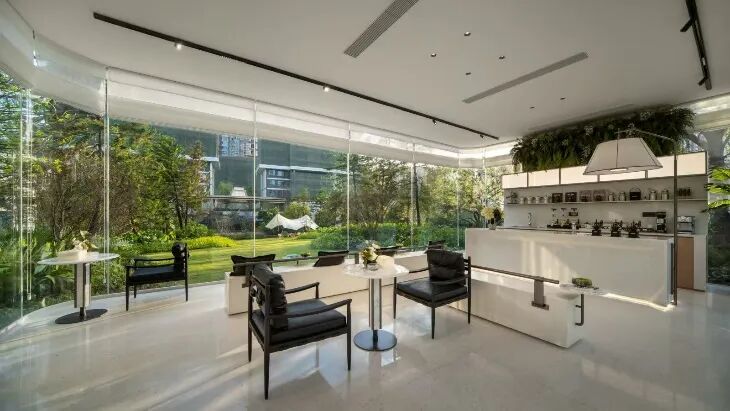 值得一提的是1+5泛会所体系,不同于下沉式的会所设计,润百合将健身空间、阅读会客区、咖啡吧等功能场景都置于一楼架空层。未来,当业主在跑步时,眼前便是淌淌流过的秀水河……实用与美观兼具的公区空间,让润百合从“推窗见景”再一次升维为“栖居风景之中”。