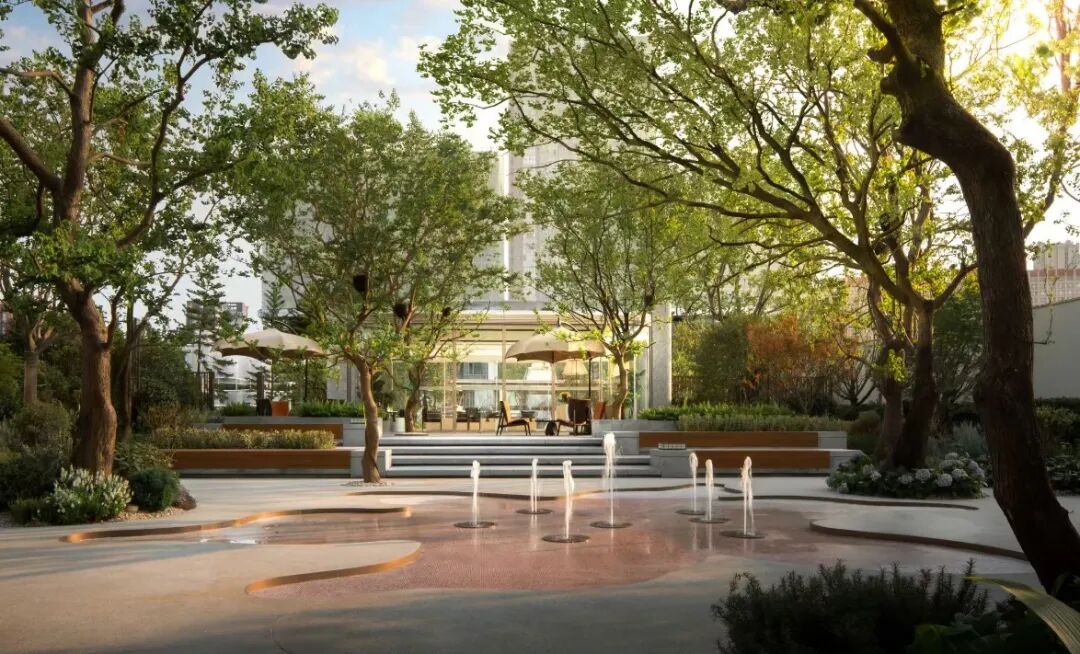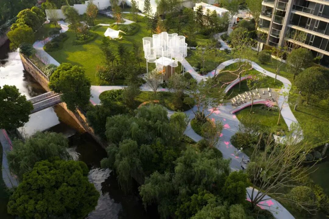 结合成都公园城市的特质,设计团队将南北地块中间的秀水河转化为独一无二的坡地河流的景观优势。约8000㎡的秀水河公园被完整嵌入南北地块之间,让河流成为社区的流动画卷,让公园成为归家的必经之路。推窗即景、出门入园——真正把家“种”在了公园里。