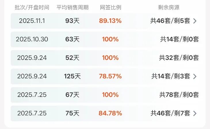 在2025年成都改善市场分化加剧的大背景下,润百合逆势走出独立行情:8月16日首开即热销3.6亿元;后续每次取证依然延续热盘效应,每批次房源平均销售周期不过两个月,整个项目仅隔8个月,整体去化率约93%。目前,仅剩个位数的建面约160/170㎡户型。这一去化热度从首开到如今即将收官之际都持续领跑500-800万级改善赛道。